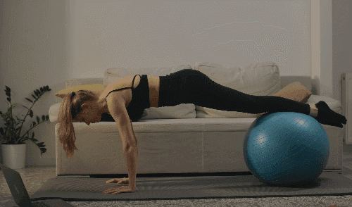 매트에 엎드려 플랭크 자세를 취합니다. 이때 양발을 짐볼 위에 올립니다. 복부에 힘을 주며, 무릎을 구부리면서 짐볼을 몸 쪽으로 당깁니다. 무릎을 다시 펴면서 짐볼을 원위치로 되돌립니다.