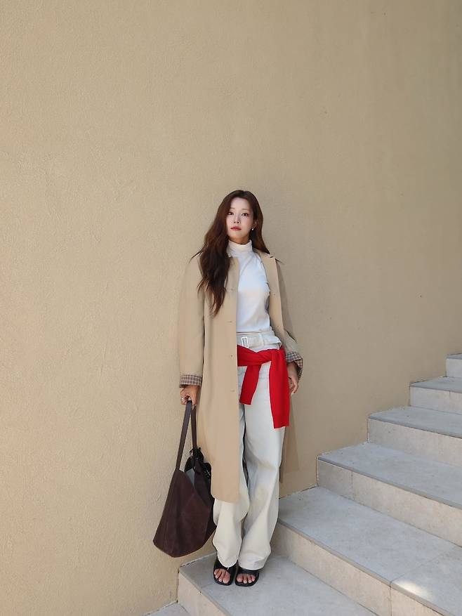 패션 포인트는 ‘절제된 대비’다. 뉴트럴 톤으로 안정감을 준 뒤 레드로 강렬한 대비를 주는 방식은 가을철 누구나 활용하기 좋은 팁이다. 여기에 배지연처럼 코트를 무심하게 걸치거나, 니트를 어깨나 허리에 묶어 레이어드 효과를 주면 분위기를 단숨에 업그레이드할 수 있다. 화사한 톤의 와이드 팬츠는 각선미를 강조하면서도 활동성을 살려, 도심 속 일상과 여행지 모두 어울린다.