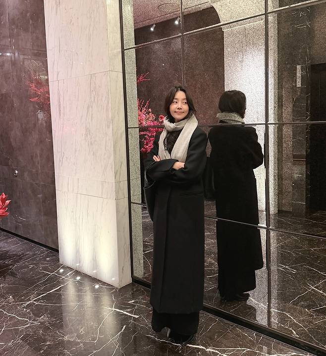 한지혜는 모노톤을 베이스로 한 지적이면서도 우아한 윈터 룩을 보여주고 있어요.