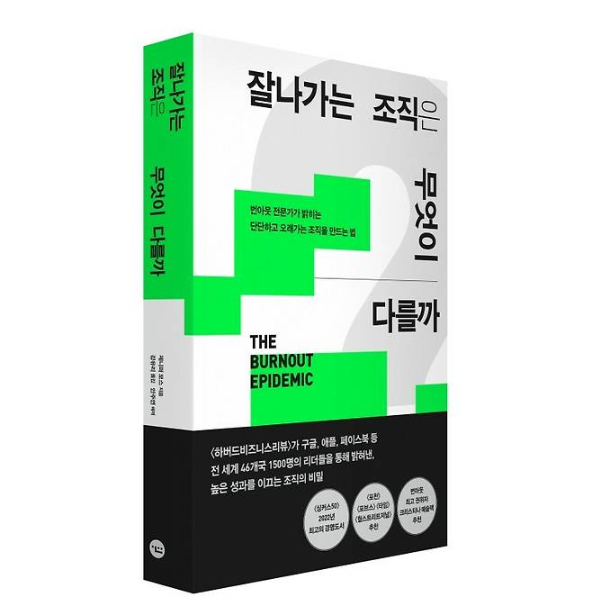 《잘나가는 조직은 무엇이 다를까》는 리더와 직원 개개인의 번아웃을 예방하고, 보다 건강하고 생산적인 직장 문화를 만드는 방법을 제안하는 번아웃 안내서다. 이 책에서 저자인 제니퍼 모스는 실제 번아웃을 겪었던 자신의 경험뿐 아니라 구글, 애플, 페이스북을 포함한 전 세계 46개국 1500명의 리더 인터뷰와 사례, 팬데믹 시기를 관통하는 번아웃 관련 최신 심리 이론과 번아웃 최고 권위자들과의 공동 연구 결과 등을 총망라하여 번아웃이라는 현상을 분석하고 그 해결책을 제시한다.