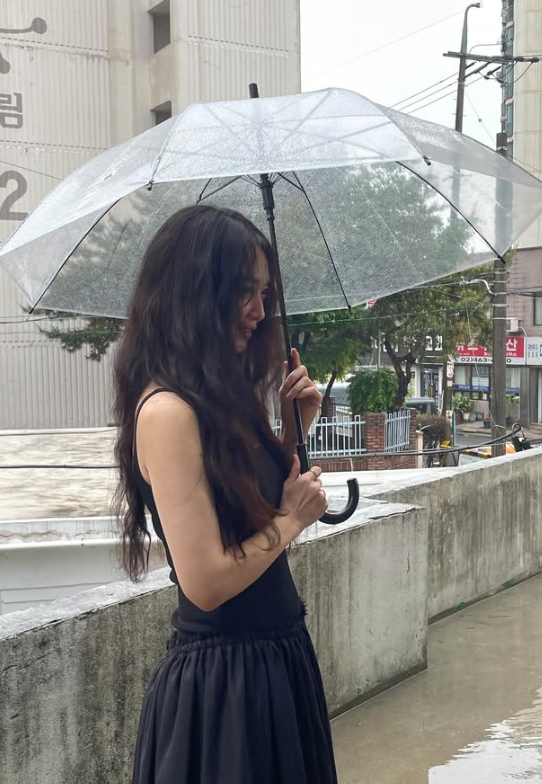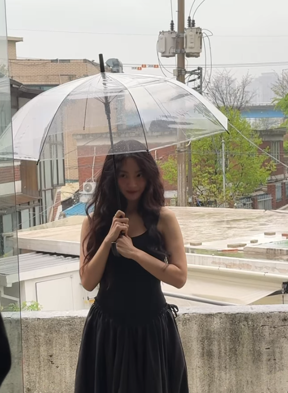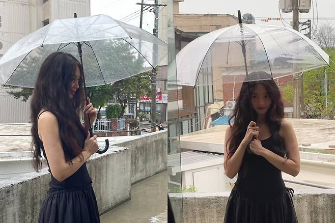 여기에 A라인 블랙 민소매 드레스를 매치해 청순하면서도 귀여운 느낌을 더하며, 시크한 무드까지 자아냈다.