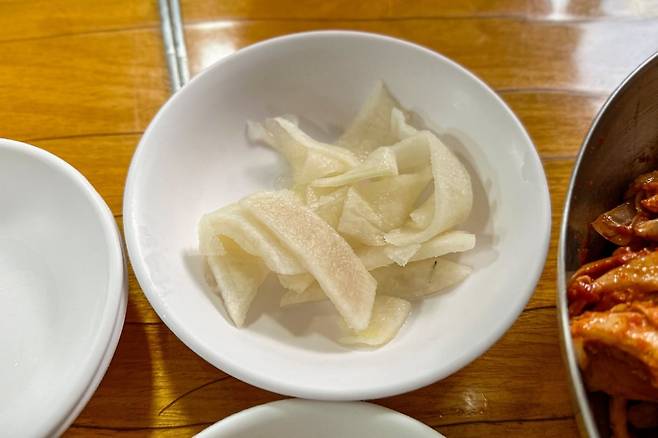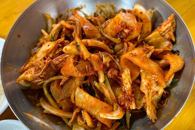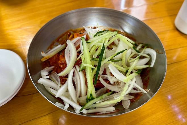 오래전부터 시장에서 상인의 입맛과 소주 한 잔에 친구처럼 지내던 사이여서 그런지 가격부터가 서민적이다. 물냉면이 11,500원, 비빔냉면은 12,000원이다. 곱빼기는 2천 원을 추가하면 된다. 빈대떡은 6천 원. 이 집의 또 다른 명물은 무침이다. 닭무침 또는 제육무침이 그것이다. 모두 16,000원이다. 기본은 닭과 제육에 비빔냉면 무침과 파, 양파 등을 넣고 조물조물 비벼낸 무침이다. 호불호는 조금 있을 듯하다. 이것도 따뜻한 음식이 아닌 냉무침이다. 고기가 식으면 냄새가 더해지는 데 비교적 그것을 잘 잡았지만, 그래도 사람에 따라서는 호불호가 있을 듯하다.