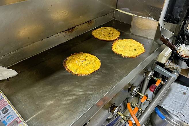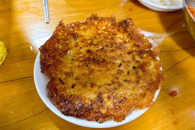 부원면옥은 찾아가는 길이 어렵다. 좁은 시장 골목 중간쯤 자리 잡고 있고 1층이 아닌 2층에 있어 눈을 잘 들고 가야 간판이 보인다. 좁은 계단을 올라가면 입구에는 커다란 그리들에서 자글자글 빈대떡이 구워지고 있다. 여기 빈대떡은 꼭 드셔야 하는데 보통의 빈대떡은 도톰한데 여기는 조금 얇은 편이지만 맛과 식감이 좋다. 아삭하게 씹히는 맛이 기억에 남는데 이유는 여기는 돼지기름에 빈대떡을 굽기 때문이다. 기름지다 보니 술안주로 잘 어울린다.