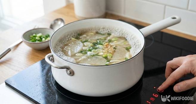 처음 끓어오를 때 한두 차례 거품을 걷어내면 국물이 한결 맑아진다. 너무 많이 걷어낼 필요는 없지만, 끓기 시작한 직후 올라오는 거품 정도는 정리해 두는 편이 낫다. 이후에는 불 조절을 하면서 기름층만 가볍게 떠내면 충분하다.