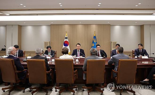 (서울=연합뉴스) 진성철 기자 = 윤석열 대통령이 25일 서울 용산 대통령실 청사에서 영 킴, 아미 베라 의원 등 미국 하원 코리아스터디그룹 대표단을 접견하고 있다. 2024.3.25 [대통령실 제공. 재판매 및 DB 금지]