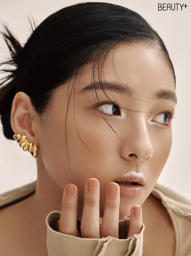 눈가를 라테 컬러로 물들였다. 라테를 닮은 연브라운 컬러를 부드럽게 스머지한 아이 메이크업. 아이 메이크업 전, 아이 프라이머를 아이홀 전체에 꼼꼼하게 바르는 것부터 시작할 것. 눈두덩의 피부 바탕을 균일하고 매끈하게 만들어야 아이섀도가 얼룩지는 것을 방지할 수 있다. 통통한 섀도 브러시를 이용해 연브라운 컬러 섀도를 아이홀 전체에 블렌딩한 다음, 쌍꺼풀 라인 주변에만 딥 브라운 컬러의 섀도로 레이어링할 것. 부드러우면서도 그윽한 눈매를 연출할 수 있다.