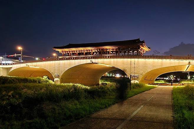 전주천 위로 비치는 옛 풍류의 흔적. 옛 선비들이 누각에 올라 시를 읊었던 때의 풍류가 재현되는 전주 가볼 곳, 청연루다. 밤이 되면 누각의 조명이 켜지는데, 전주천 수면 위에 비친 다리와 누각의 반영이 운치 있다.