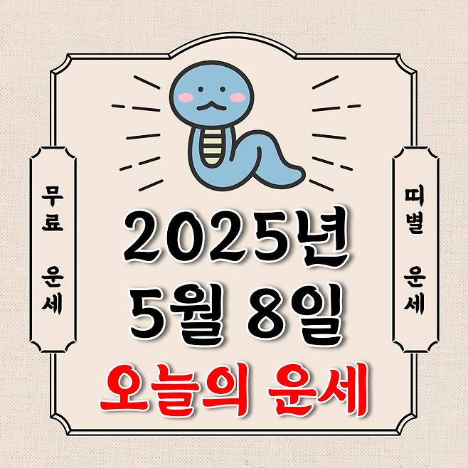 [오늘의 운세]오늘의 운세 2025년 5월 8일 목요일 (음력 4월 11일 / 띠별 운세 / 생년월일 운세)에 대해 알아 보겠습니다.살구뉴스 오늘의 운세는 SNS 문화에 밝은 세대를 중심으로 재편하여 그 나이에 궁금한 점을 해소해 주는 데 중점을 두었습니다. 음과 양, 오행의 발달에 중점을 두고 분석했습니다. 대운, 연운, 격국, 합과 충 등은 고려할 수 없어 분석 자료로 활용하지 않았습니다. 말 그대로 재미로 보는 오늘의 운세입니다.그럼 각 년생 오늘의 운세에 대해 알아보겠습니다~!● 쥐띠(子)변화와 도전을 추구하면서도 게으름으로 시간을 낭비할 수 있으니 조심하세요. 나에게 가장 중요한 일을 헤아리기 힘든 하루이군요. 재정비에 힘쓰고 철저한 준비를 해야 할 때이군요.1996시간이 된다면 잠시 드라이브나 여행을 떠나보세요. 친구나 애인과 부담없이 떠나는 단거리 여행에서 커다란 행복을 느낄거예요. 오늘은 일이나 학업에는 집중이 되지 않는군요.1984오늘은 나의 능력을 인정 받게 되는군