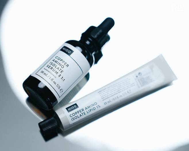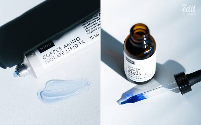 물처럼 흐르는 제형의 니오드의 ‘카퍼 아미노 아이솔레이트 세럼 3 1:1(CAIS3)’과 튜브타입의 ‘카퍼 아미노 아이솔레이트 리피드 1%(CAIL)’두 제품 모두 카퍼 펩타이즈라는 성분을 메인으로 하고 있는데요. 푸른빛을 띠는 이 성분은 우리 몸과 피부가 원래 가지고 있는 성분으로 피부 건강을 위한 다양하 역할을 수행하고 있어요. 눈에 보이는 노화 증상 케어를 도와주고 고르지 못한 피부 결 및 피부 톤을 개선해 생기를 잃은 칙칙한 피부에 도움을 줍니다. 두 제품은 한달 동안 가로수길 매장에서 50% 할인을 한다고 하네요.