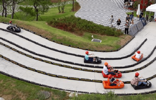 강화도 루지는 특수 제작된 카트를 타고 땅의 경사와 중력만을 이용해 1.8km의 트랙을 내려오는 다이나믹 체험 시설인데요. 트랙 경사도가 완만한 편이라 남녀노소 즐기기 좋다는 장점을 가지고 있습니다.