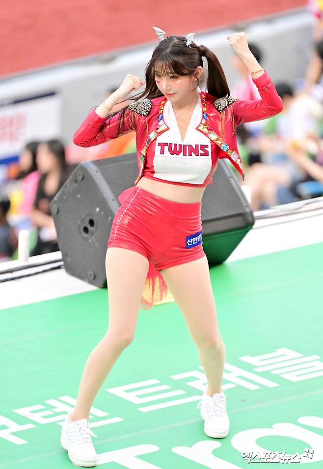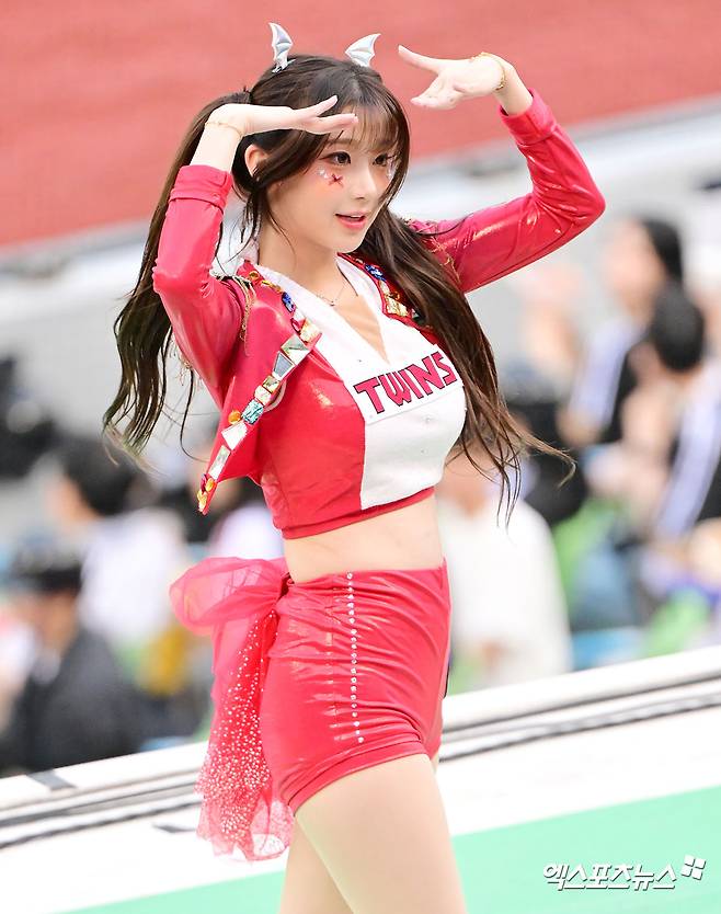 28일 오후 서울 송파구 잠실야구장에서 열린 '2025 신한 SOL Bank KBO리그' 한화 이글스와 LG 트윈스의 경기에서 응원단상에 올라간 이주은 치어리더는 강렬한 레드 컬러의 정복에 양갈래 헤어스타일을 선보였다. 거기에 악마의 날개를 표현한 머리띠를 착용해 귀여운 악마같은 느낌을 표현했다.