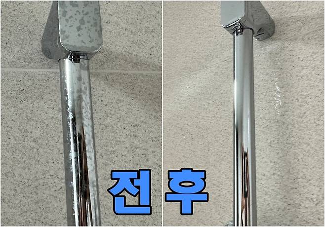 물로 남아있는 치약을 헹궈주시면 이렇게 광이 나는 욕실로 바꿀 수 있습니다. 백화현상 하나만 제거되어도 욕실이 깨끗해져 보이죠?