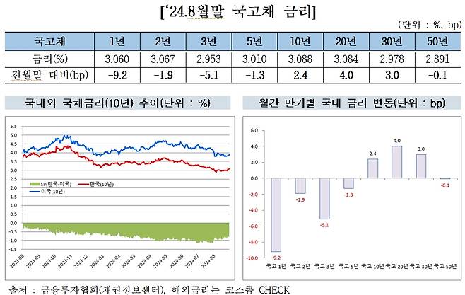 9일 금융투자협회에 따르면 8월말 기준 국고채 1년물 수익률은 3.06%로 전월말 대비 9.2bp(1bp=0.01%포인트) 하락했다.