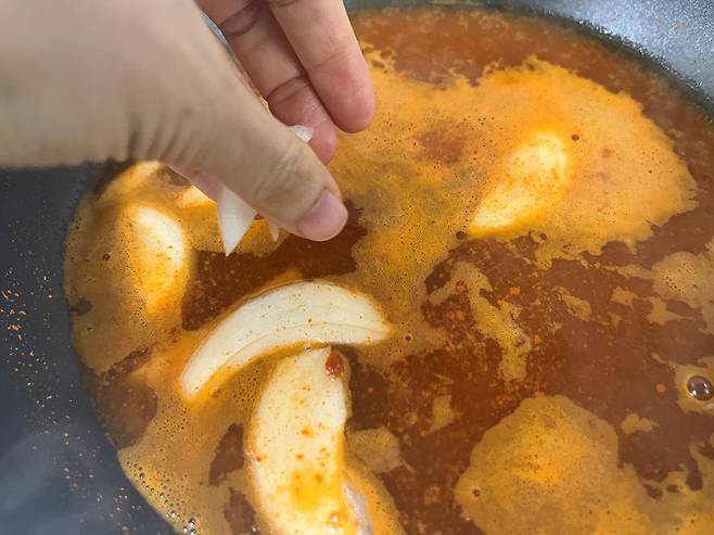 양념이 끓기 시작하면 양배추, 양파 등 채소를 먼저 넣습니다. 취향에 따라 채소는 넣지 않아도 무방합니다.