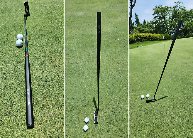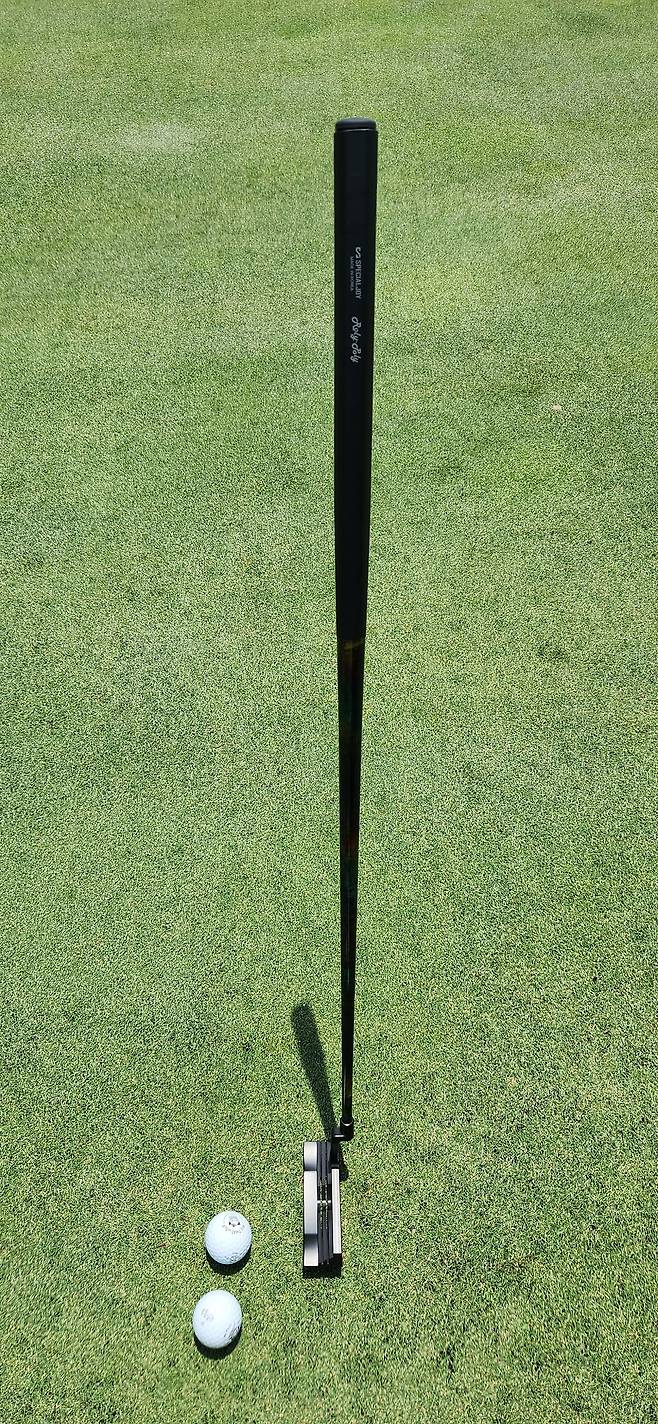 마지막으로, 위에서 언급했듯이 퍼터 샤프트가 50그램 이하로 가벼워서 거의 모든 퍼터를 스스로 서있게 만든답니다. 저도 필드에서 해봤는데... 일단 그린이 완전히 평평해야 되네요. 하지만 저의 생각으로는 말렛 퍼터 헤드에 끼운다면 아주 안정적일듯합니다. 사진처럼 퍼터를 세워두고 올바르게 잘 겨냥했는지도 체크 가능한 재밌는 기능도 가능합니다.
