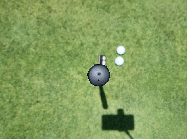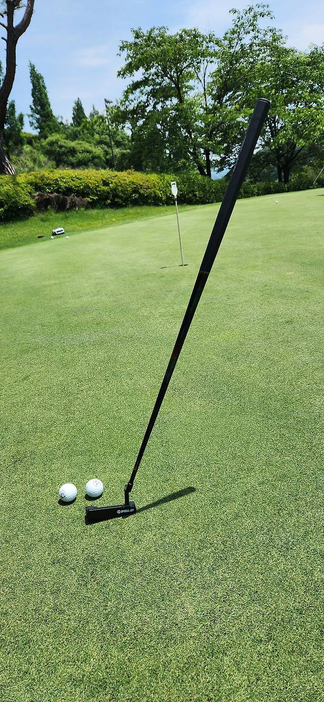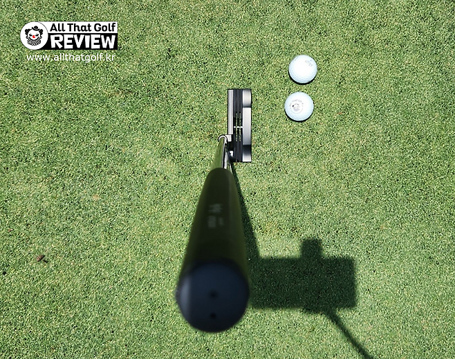 아직 정렬에 대한 온전한 자신감이 없어서 그런지 100% 자신 있게 때리지 못하네요. 하지만 특히 다르다는 느낌이 없어서 곧 여느 퍼터 못지않게 사용할 수 있다는 느낌은 듭니다.