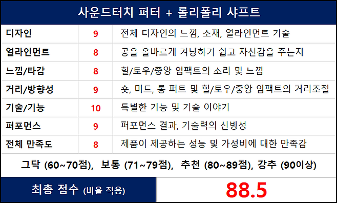 아래 후기에서는 사운드 터치 퍼터라고 명칭하겠습니다. 또한, 점수는 헤드와 샤프트 별도가 아닌 하나의 퍼터 제품으로 주는 점수입니다. 생소한 기능과 기술에 대해 약간 미흠한 저의 설명과 표현력에 대해서도 미리 양해를 부탁드리며, 신기한 사운드 터치 퍼터를 소개해 보겠습니다^^