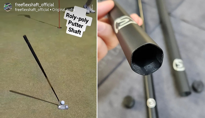롤리폴리 퍼터 샤프트는 정말 특이해서 바로 시선을 강타합니다. 일단, 퍼터를 스스로 서있게 만들 정도로 매우 가볍습니다 (50그램 이하). 또한, 두께가 일반 스틸 샤프트보다 거의 2배로 두꺼우며, 전체 길이가 모두 카본 소재로 만들어져 있습니다. 특이하게도, 일반적인 퍼터 그립이 필요 없으며, 손으로 잡는 부분은 6각 모양으로 두툼합니다.