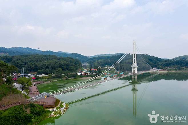 충남 예산군에 위치한 예당호는 우리나라에서 가장 큰 저수지로, 그 중심에는 길이 402m에 달하는 국내 최장 출렁다리가 있다.