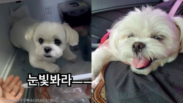 녀석은 어쩌다 이렇게 냉장고 안에 들어가게 됐을까요? 보호자는 "당시 제가 뚜뚜를 안은 상태에서 냉장고 문을 열어 음료수를 꺼내고 있었는데, 기어코 냉장고 안에 들어가겠다고 발버둥을 치더니 저를 밀어내면서 냉장고 칸 안에 쏙 들어갔다"고 설명했습니다.