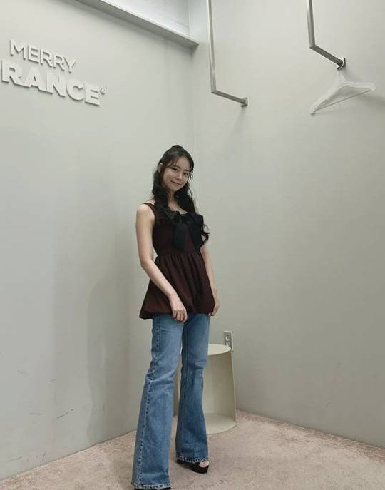 부츠컷 데님이 눈에 띄어요. 라인을 살리는 선택.
