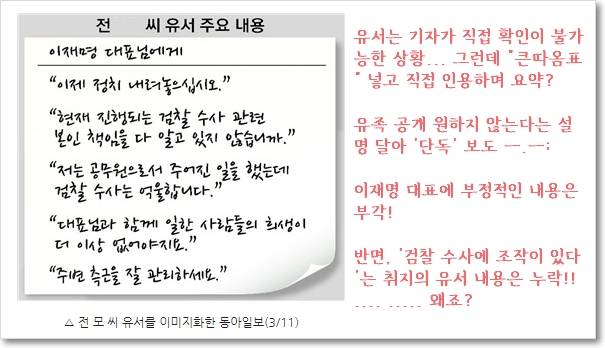 그러나 직접 확인이 불가능한 유서의 내용은 ‘유족이 공개되기를 원치 않는다’는 설명과 함께 언론에 ‘단독’을 달고 보도되기 시작했습니다. 동아일보 [단독/“이재명 대표님, 이제 정치 내려놓으십시오…함께 일한 사람들 희생 더 이상 없어야지요”] (3월 11일 이경진·주현우 기자)는 “전 씨는 유서에서 이 대표를 향해 ‘이제 정치 내려놓으십시오. 대표님과 함께 일한 사람들의 희생이 더 이상 없어야지요’라며 ‘현재 진행되는 검찰 수사 관련 본인 책임을 다 알고 있지 않습니까’라는 취지의 내용이 담긴 것으로 전해졌다”고 보도했는데요. 기사 서술 대부분이 ‘알려졌다’·‘전해졌다’·‘풀이된다’·‘담겼다고 한다’ 등 입니다.