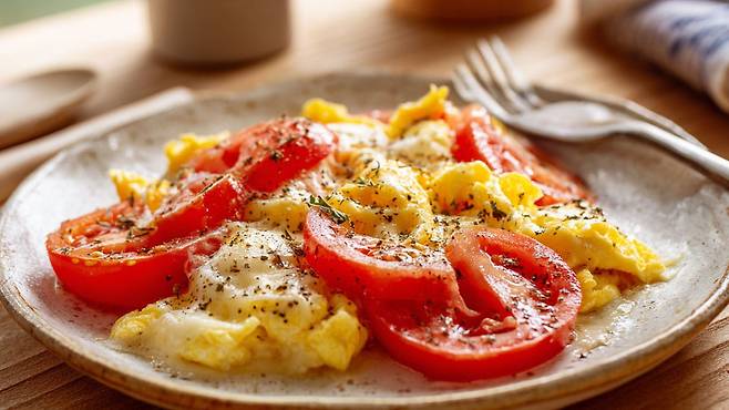 이 요리의 핵심은 ‘간단하지만 균형 잡힌 조화’다. 먼저 토마토를 익혀 수분을 줄이고, 소량의 소금을 뿌려 단맛을 살린다. 여기에 풀어둔 계란물을 부어 중 약불로 부드럽게 익히면 부드러운 스크램블 형태가 완성된다.