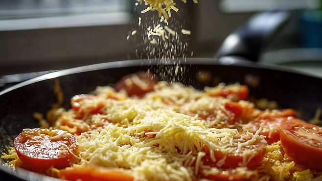마지막으로 슈레드 치즈를 올려 남은 열로 녹이면 고소한 풍미가 퍼지고, 치즈가 토마토와 계란을 자연스럽게 감싼다.