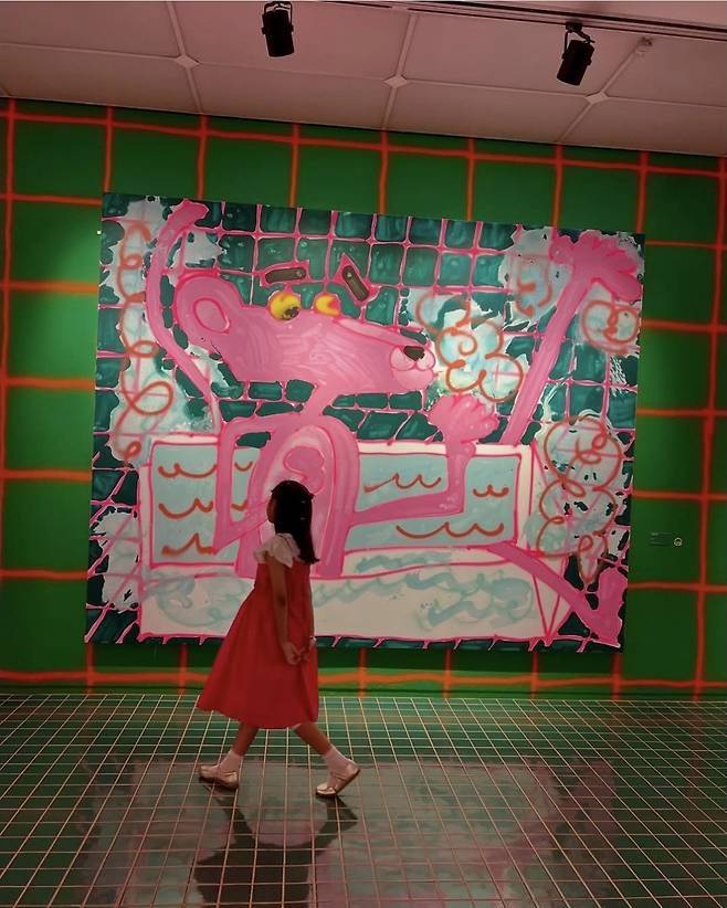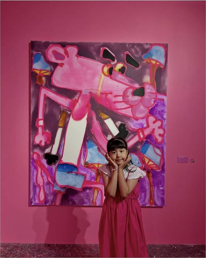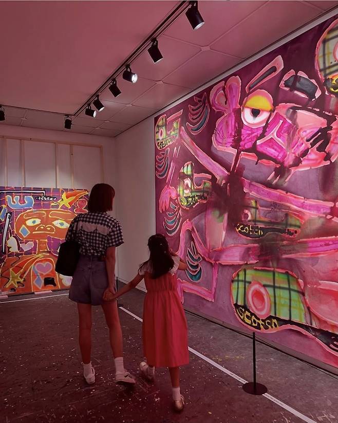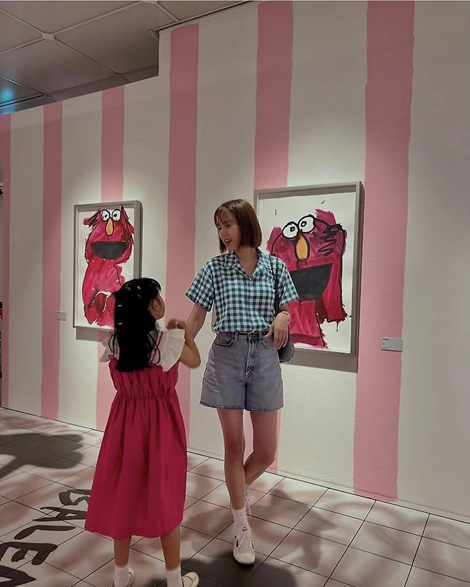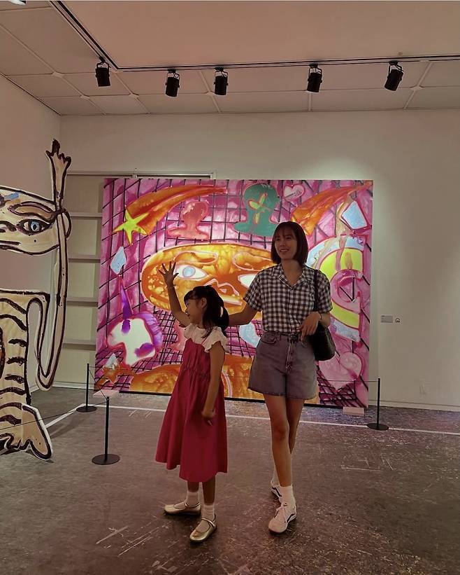 컬러풀한 전시 작품을 배경으로 두 사람은 마치 동화 속 한 장면처럼 포즈를 취했으며, 조윤희는 팔을 살짝 감싸며 딸을 다정히 바라보는 모습으로 '현실 엄마 모먼트'를 드러냈습니다.