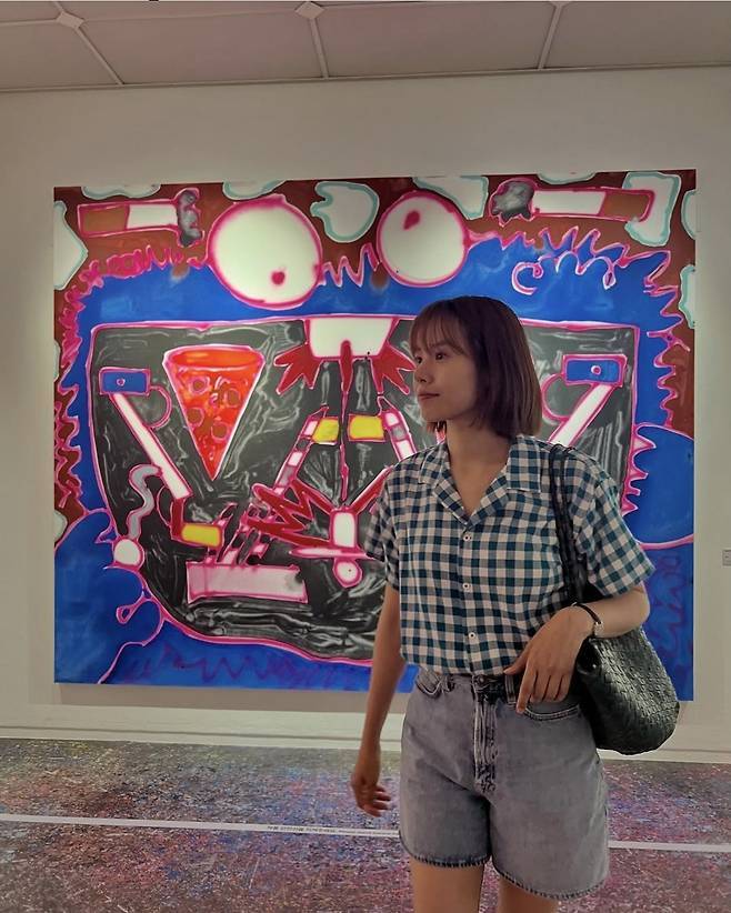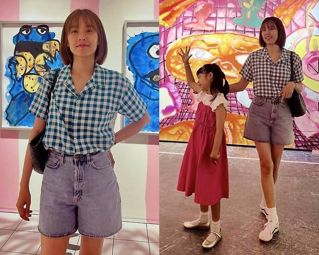 조윤희는 청록빛 깅엄 체크 셔츠에 하이웨이스트 데님 쇼츠를 매치해, 레트로하면서도 산뜻한 썸머 무드를 연출했습니다.