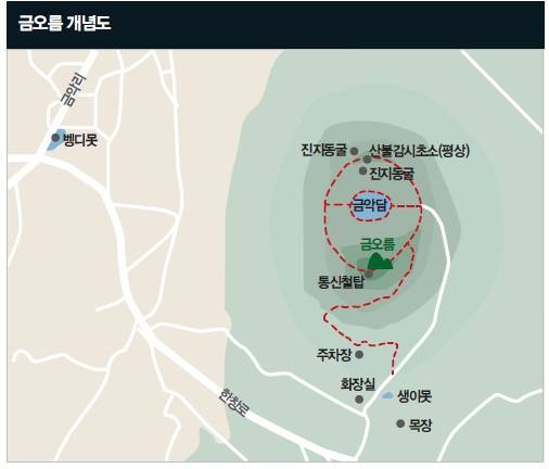 '금오름'이라니, 이름만으로는 갑甲이겠다. 그런데 알고 보니 금, 은, 동의 그 금金이 아니다. 정확한 유래는 확인할 길 없으나 조선시대에 제작된 고지도에 오름 자락의 마을인 금악리를 '흑악黑岳' 또는 '흑악촌黑岳村'이라 표기하고 있다 하니, 이를 미루어 짐작해 볼 때 '검은오름'이 변해 금今오름이 된 게 아닐까 싶다.