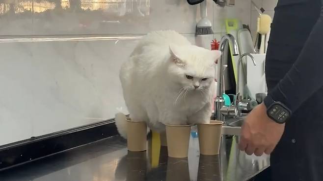 남성은 고양이를 살짝 안아 올려, 작은 발을 하나씩 종이컵에 조심스럽게 넣었습니다. 갑자기 족욕을 하게 된 고양이는 당연히 가만히 있을 리 없었죠. 품에서 벗어나려고 버둥거리면서, 마치 "이게 무슨 일이냐"고 따지는 듯한 울음소리를 냈습니다.