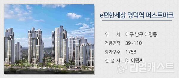 DL이앤씨는 대구 남구 대명동에서 'e편한세상 명덕역 퍼스트마크'를 분양합니다. 대구지하철 1·3호선 명덕역과 붙어 있습니다. 영선초, 경상중, 대구제일중, 경구중, 경북예고, 경북여고, 대구고 등 학군도 우수합니다.