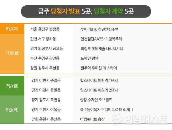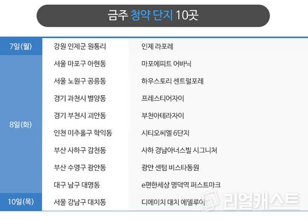 특히 금주에는 서울 강남, 마포, 경기 과천 등 선호도 높은 지역들에서 물량이 나올 예정입니다. 역세권 입지를 갖추면서 교육 환경이 좋은 학군지 현장들이 대거 분포하는 만큼 많은 예비청약자들의 관심을 끌 것으로 보입니다.