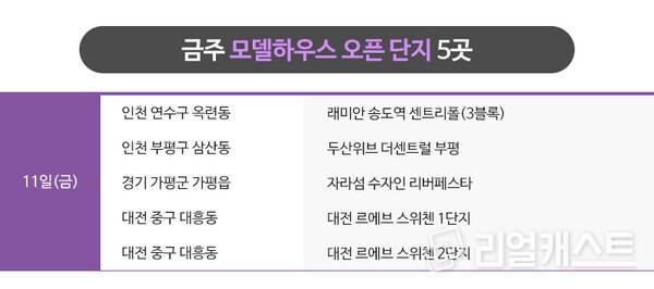 금주 모델하우스는 총 5곳이 오픈 예정입니다. 수도권에서 인천 2곳, 경기 가평 1곳을 비롯해 지방에선 대전에 예정돼 있습니다.