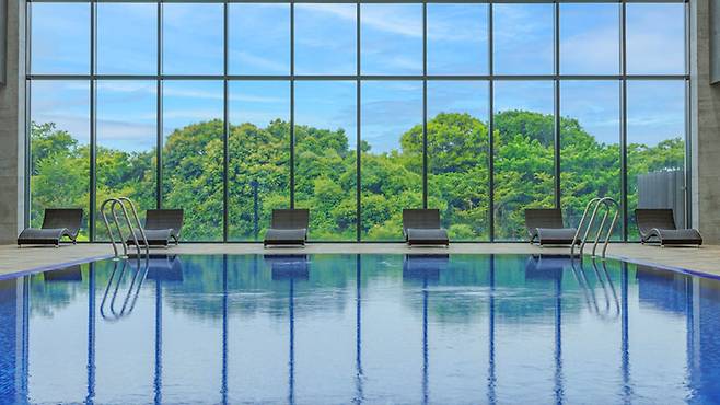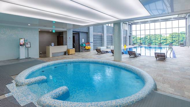 최상의 힐링: 유리창 너머로 제주의 비경이 펼쳐지는 실내 수영장과 노천 온수풀을 동시에 즐길 수 있습니다.