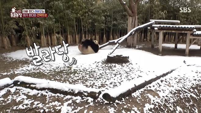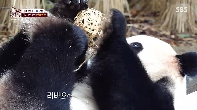 급기야 새끼를 끌어안듯, 발라당 누워 대나무공을 비행기 태우기까지 합니다. 그 광경을 지켜보던 '강바오' 강철원 사육사도 "러바오, 애기 냄새가 나지 거기서" 라며 흐뭇해했죠.