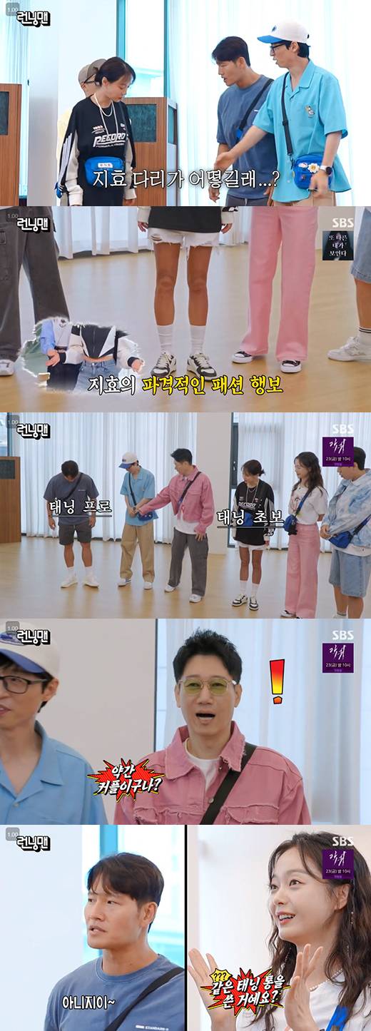 개그맨 유재석은 "약간 커플이구나"라며 억지 러브라인을 생성했다. 그러자 가수 김종국은 "같이 한 게 아니고 태닝 어디서 하냐고 물어보길래 도와줬다. 그게 뭐, 그게 왜"라며 반응했다.