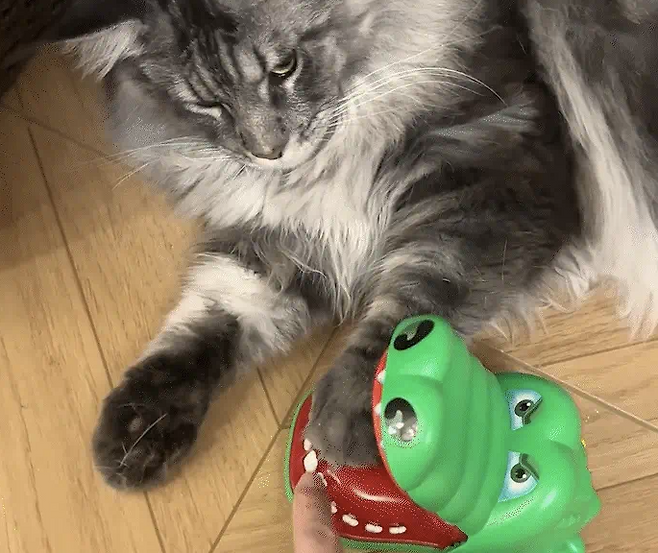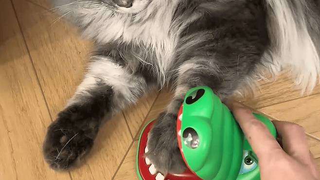 어디서 구했는지 꽤나 험악하게 생긴 악어 장난감을 꺼내더니, 고양이의 작은 발을 악어 입에 살짝 넣었습니다.