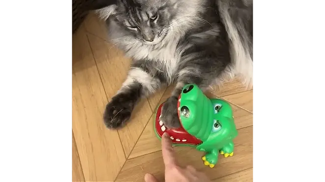 한 남성이 심심풀이로 집에서 키우는 고양이와 악어 이빨 누르기 게임을 시작했습니다.