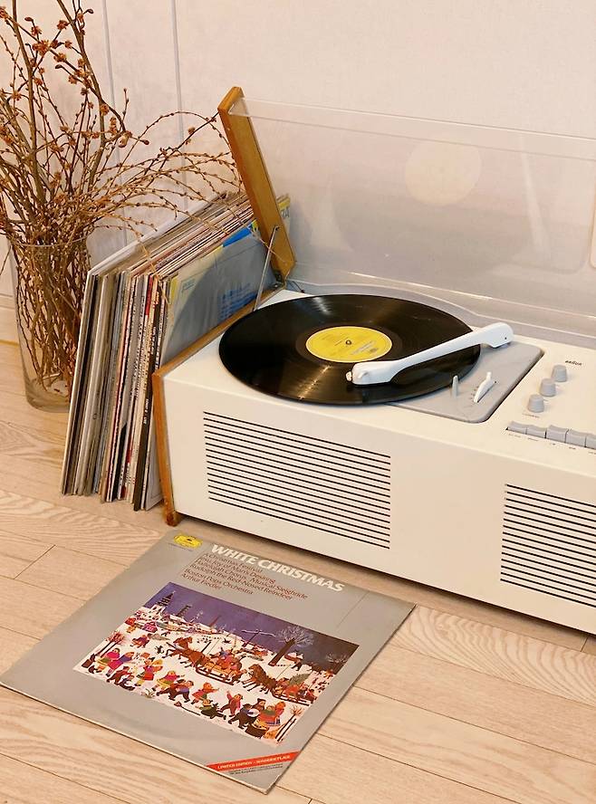제가 거실에서 가장 좋아하는 가구인 Braun 빈티지 턴 테이블이에요. 1950년대에 디터람스가 디자인한 턴 테이블로 음질이 요즘 나온 턴 테이블처럼 좋지는 않지만 디자인 자체가 너무 아름다워서 마치 오브제처럼 바라만 보고 있어도 좋은 턴 테이블이에요.