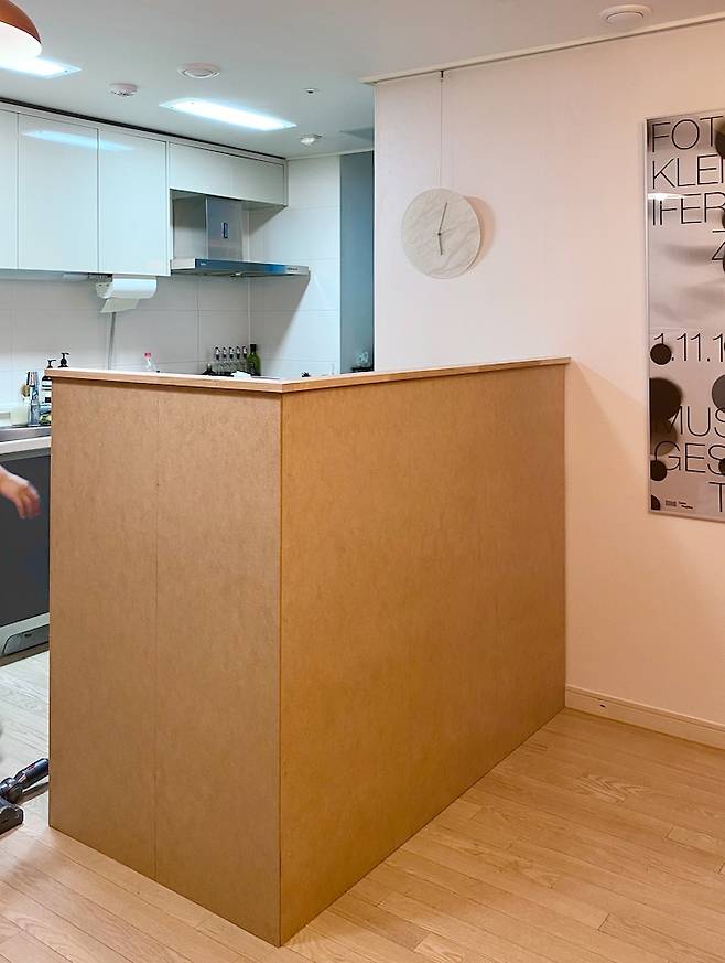 아일랜드를 ㄱ자로 감싸는 구조로 쉽게 철거가 가능하도록 고정하지 않은 형태로 제작했어요. 간단하게 가벽을 만드는 과정을 설명 드리자면