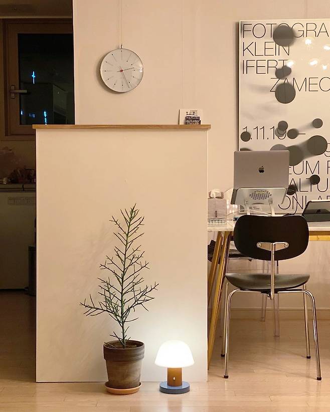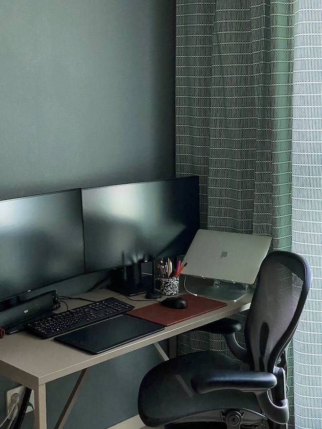 그리고 재택근무가 장기화되면서 의자의 소중함을 느끼고 구매한 허먼밀러 에어론 체어는 아주 만족하며 사용하고 있어요. 생긴 게 투박해서 조금 고민하긴 했는데 서재에서는 업무에 집중할 수 있는, 기능에 충실한 제품을 사용하자! 해서 구매를 결정하게 되었답니다. 장시간 앉아서 고통받는 저의 허리를 지켜주고 있어요!