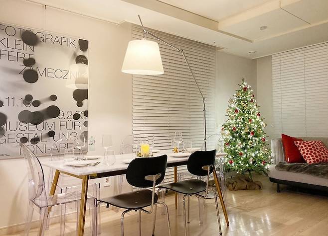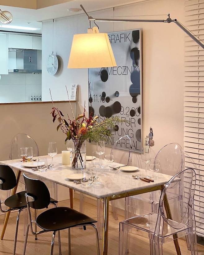 그래서 투명한 아크릴 소재의 고스트 체어와 함께 매치해 주었어요. 기존엔 식탁 의자를 전부 투명 의자로 배치를 했었는데요. 대형 포스터를 들이면서 같은 컬러 톤으로 포인트 되는 의자가 있으면 좋을 듯하여 SE68 체어 블랙을 구매하여 믹스해 보았어요.