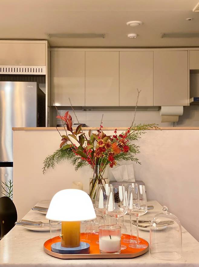 연말이라 구매한 붉은 톤의 꽃&열매 화병을 오렌지 트레이 위에 올려 스타일링 해주었어요. 겨울에 솔방울은 또 못 참으니 같이 올려주고요. 조명과 양초 등을 같이 올려 꾸며주었답니다. 앤트레디션 조명은 무선 충전이 가능하고 가벼워서 집안 곳곳 여기저기서 가져다가 쓰고 있어요. 식탁에서도 쓰고 침실에서도 쓰고 베란다에서도 쓰고 있답니다. 활용도가 굿이에요!