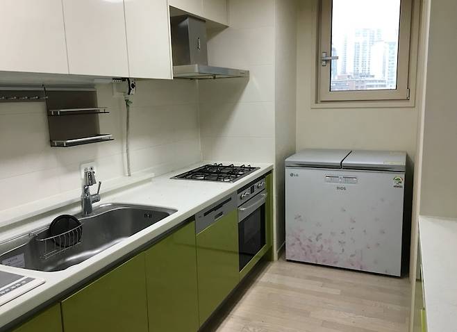 주방은 처음 이사 왔을 당시 하부장이 연두색이었어요. 그리고 집에 옵션으로 세팅되어 있던 김치냉장고엔 아주 화려한 꽃들이 피어있었어요 ^_ㅜ 요 부분은 스스로와 타협이 힘들어서 집 주인분께 양해를 구하고 시트지 시공을 셀프로 진행했어요.