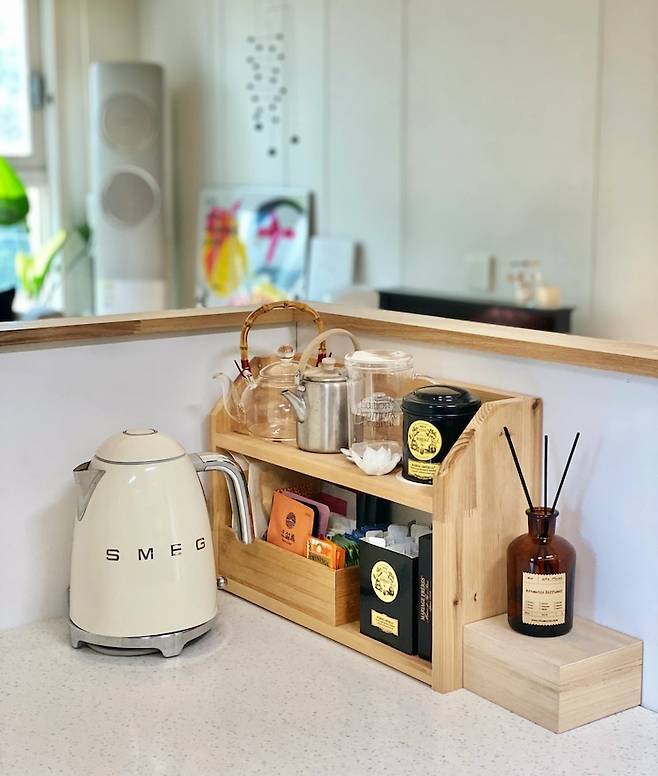다이닝과 주방 사이 가벽 뒤쪽엔 자잘한 약통, 티백들, 자주 쓰는 티팟들을 두었는데요. 가벽으로 싹 가려주니 정말 깨끗하죠?