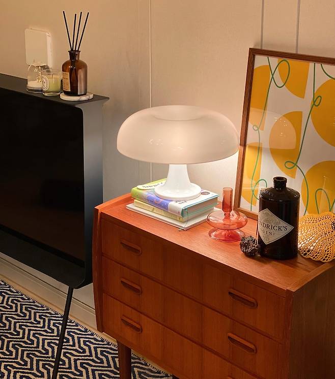 서랍장 위에는 제가 좋아하는 소품들을 올려놓는 존이에요. 개인적으로 아르떼미데 조명과 옆에 놓인 유리 문진의 조합이 참 마음에 들어요. 포인트오브뷰에서 구매한 문진인데 한눈에 반했답니다. 조명을 받으면 더 영롱하게 빛나서 아름다워요. 술을 잘 마시진 못하지만 술자리에서 가져온 핸드릭스 술병도 예쁘지 않나요?ㅋㅋ 꽃 한 송이를 꽂아놔도 참 예쁘더라고요.