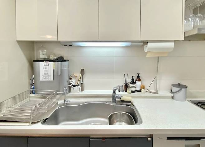 최소한의 짐만 꺼내 놓으려고 노력하고 있는 싱크대 상판 부분입니다! 정말 자주 사용하는 주방 도구들과 핸드 워시, 세제 등만 꺼내 놓고 있어요. 개인적으로 주방에서 사용하는 것 중 마음에 드는 건 라바제 식기 건조대인데요. 촘촘하면서도 미니멀하고 만듬새가 견고해서 너무 만족하며 쓰고 있는 제품입니다. 디자인이 참 멋있지 않나요?