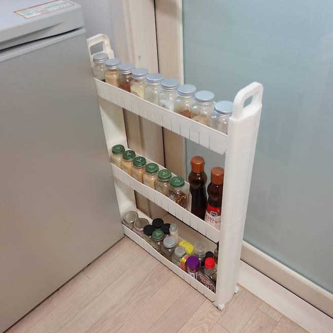 김치냉장고 옆 작은 틈새를 활용해 소스통 등을 수납해 놓았는데요. 틈새 서랍장에 바퀴가 달려 조미료들을 꺼내기가 무척 편해요!